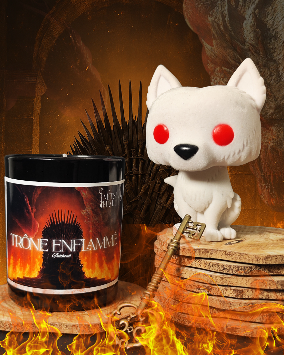 Trône enflammé  – Parfum Patchouli , un souffle des bois anciens, une bougie inspirée de la scène finale du Trône de Fer en flammes