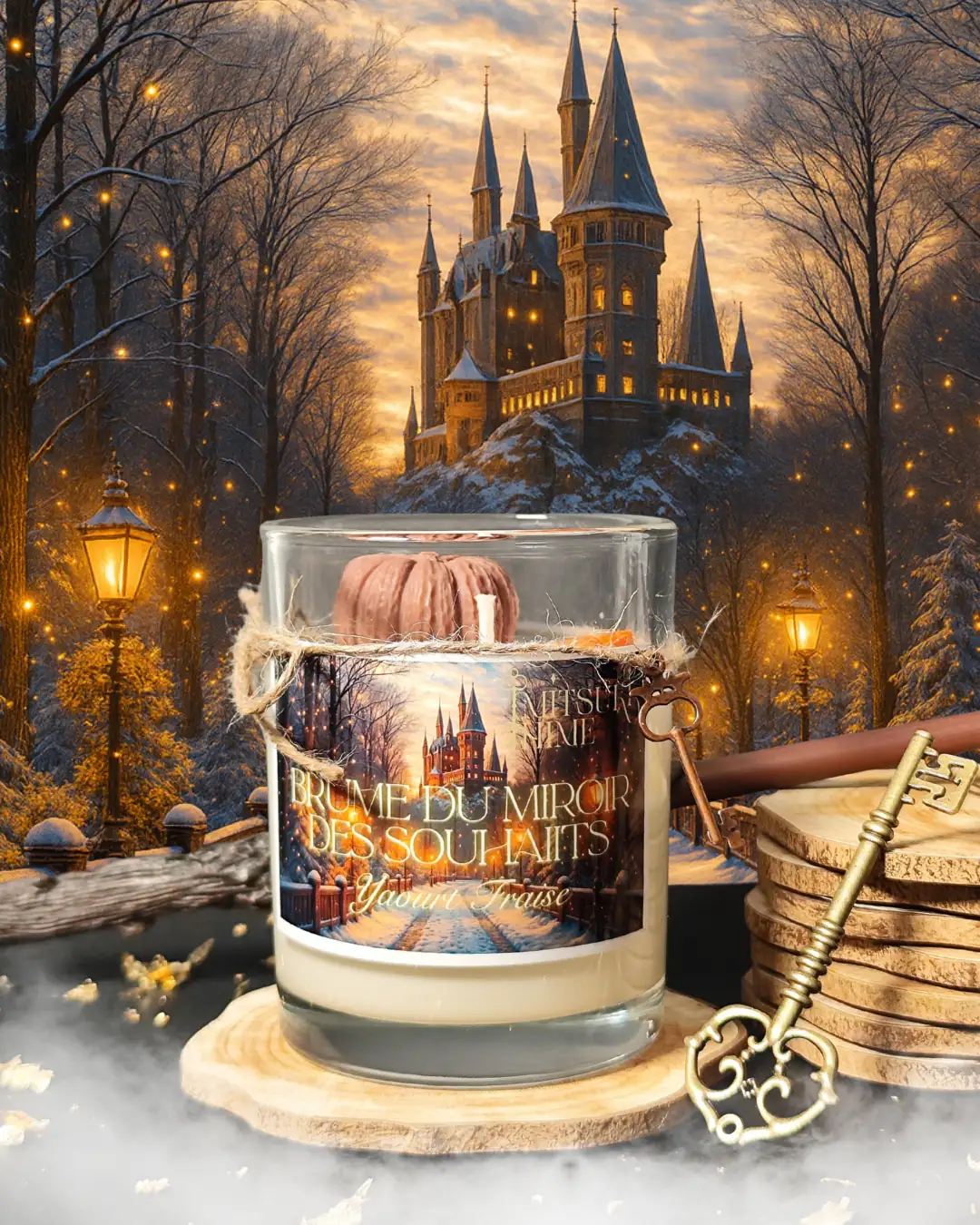 « Brume du miroir des souhaits » diffuse un parfum de yaourt fraise , plongez dans la magie du miroir le plus mystérieux de Poudlard. Cette bougie diffuse une aura envoûtante, comme une brume légère qui révèle vos désirs les plus profonds ( existe aussi en coffret mystérieux a découvrir sur la page des coffrets )